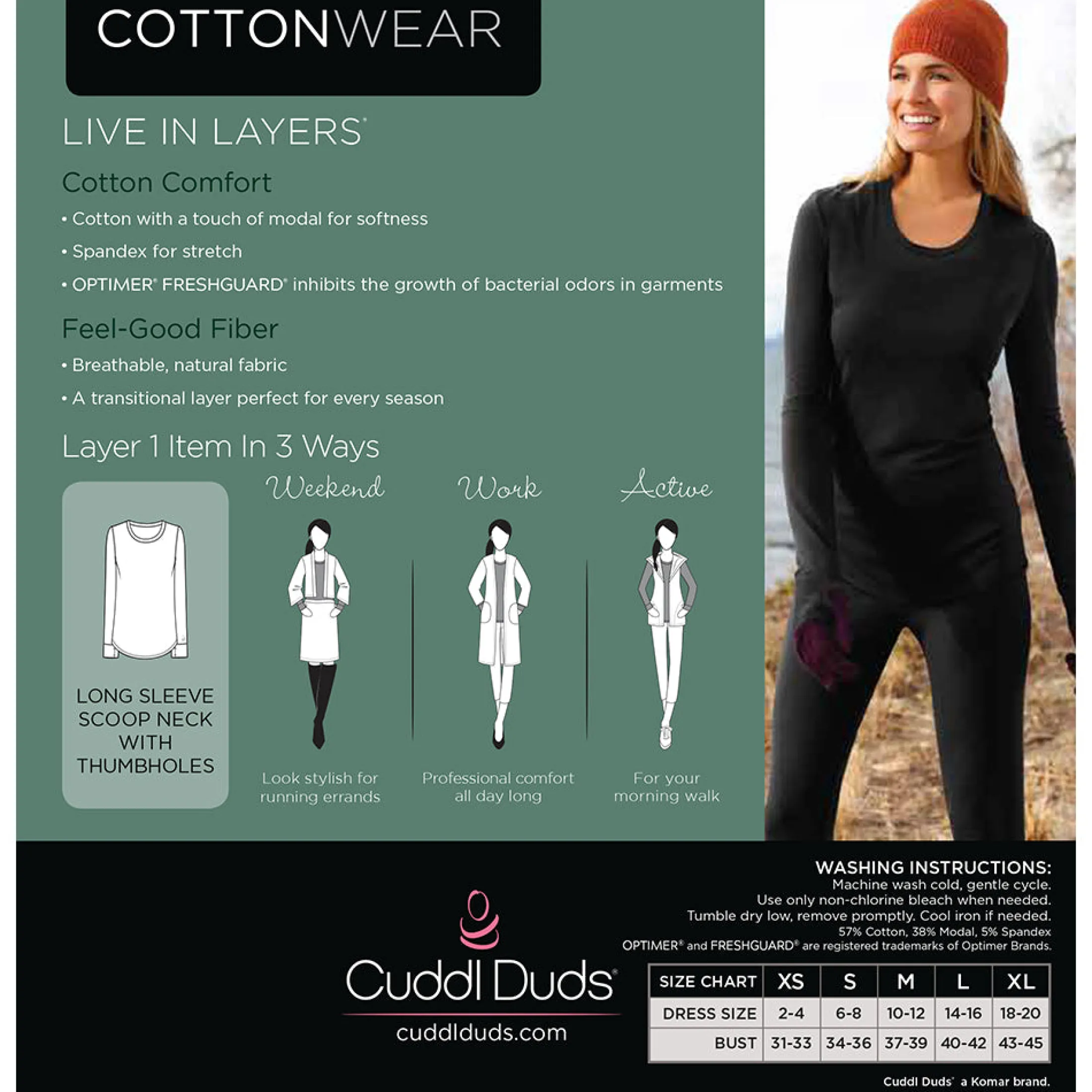 The ultimate feel-good layer, our Cottonwear Long Sleeve Scoop Neck with Thumbholes is not only soft, stretchy and breathable, but is also now updated with eco-friendly OPTIMER® FRESHGUARD® to help provide odor-control for fresh comfort. Substantial enough to wear solo and light enough to layer come sweater season.